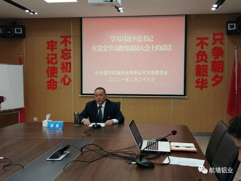 2021年2月23日,中共重慶航墻鋁業有限公司黨支部組織召開黨員大會,學習《習近平在黨史學習教育動員大會上的講話》,部署開展“學黨史”教育活動,會議邀請公司所有退伍軍人和入黨積極分子參加,由公司黨支部書記藺勇主持。 會上,支部書記藺勇原原本本的傳達學習了《習近平在黨史學習教育動員大會上的講話》精神,他強調要嚴格按照黨中央的決策部署,深入開展好學